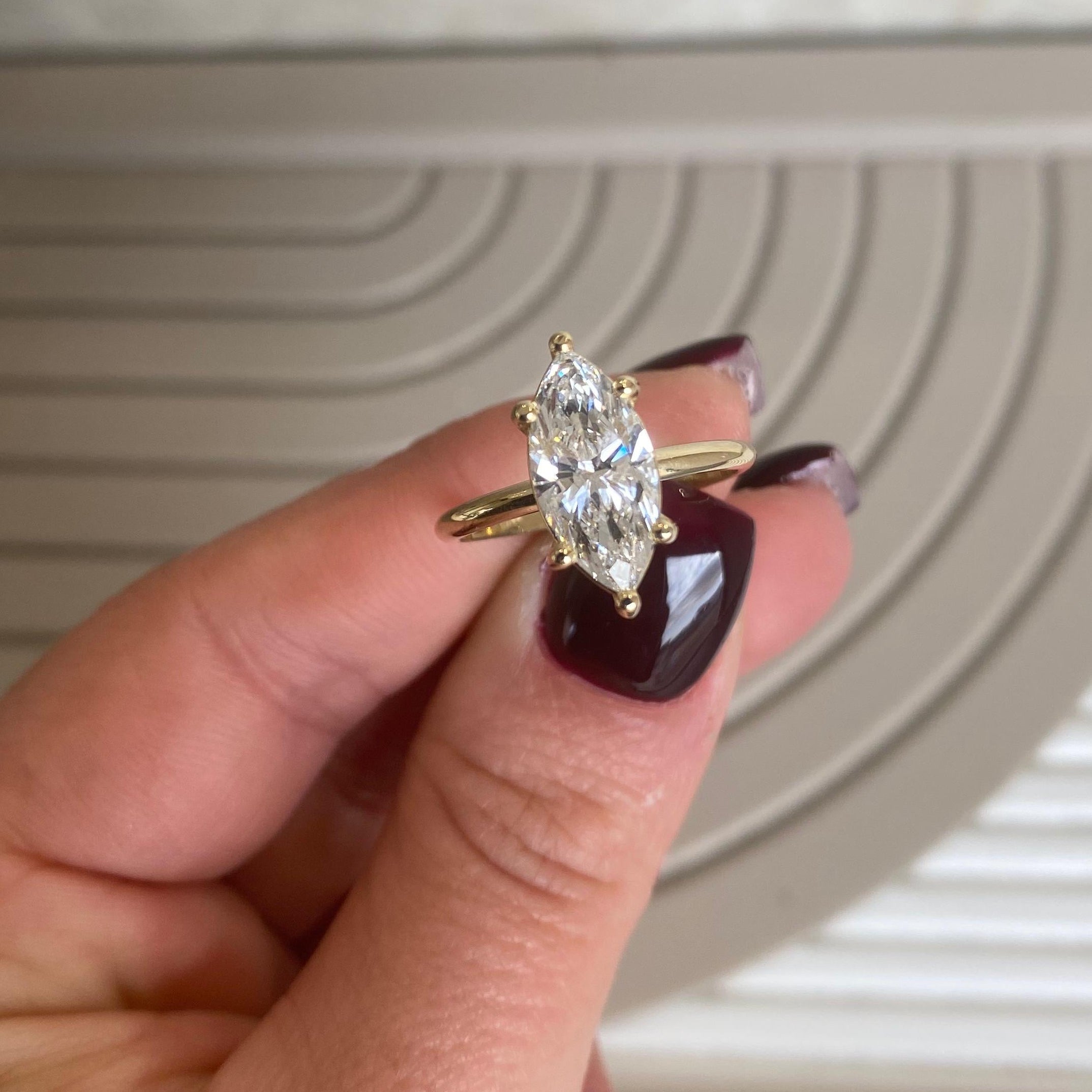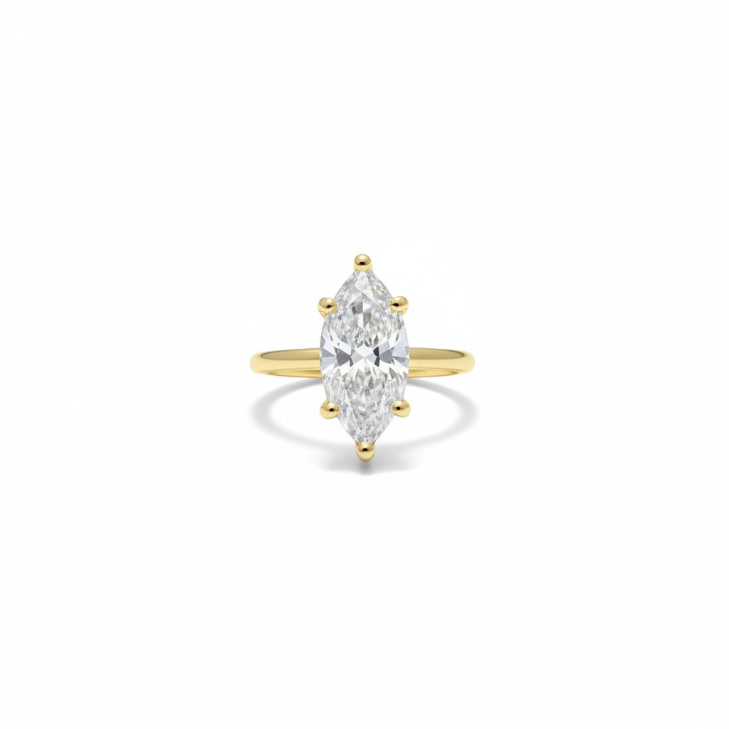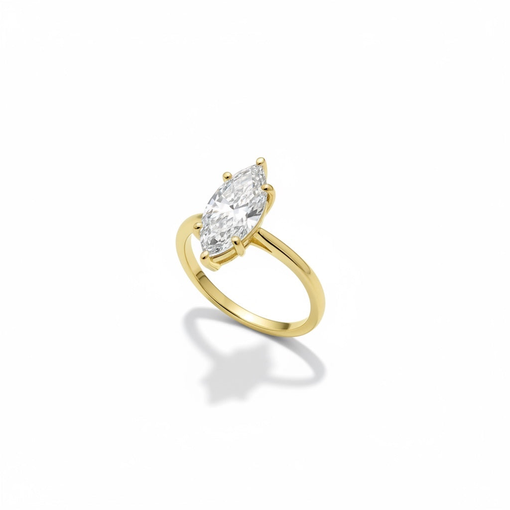 טבעת אירוסין מרהיבה משובצת ביהלום מעבדה בחיתוך מרקיזה ייחודי במשקל 2.08 קרט. עשויה מזהב צהוב 14 קראט איכותי, מושלמת להצעת אירוסין בלתי נשכחת.