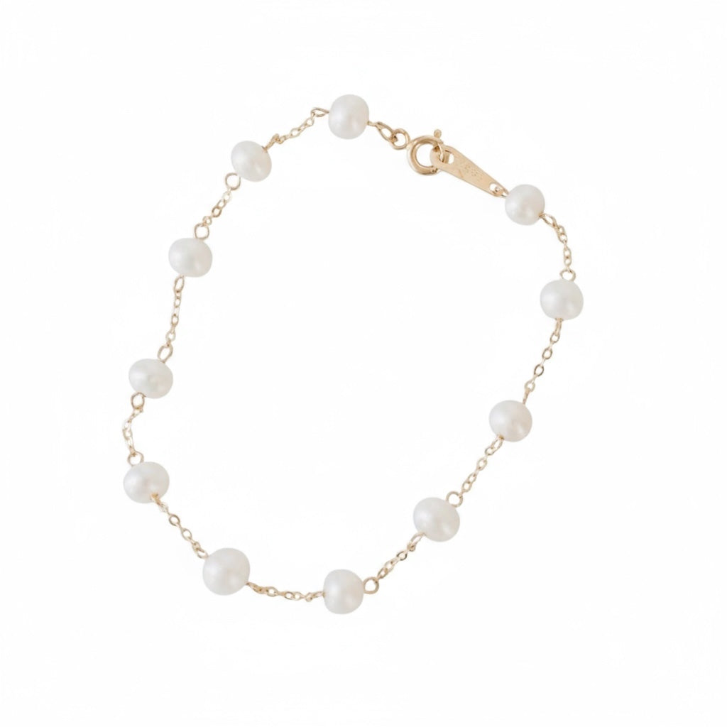 צמיד זהב 14 קראט שזור בפנינים מתורבתות. עיצוב עדין ונינוח על פרק היד שמתאים לנשים שאוהבות אלגנטיות קלאסית.