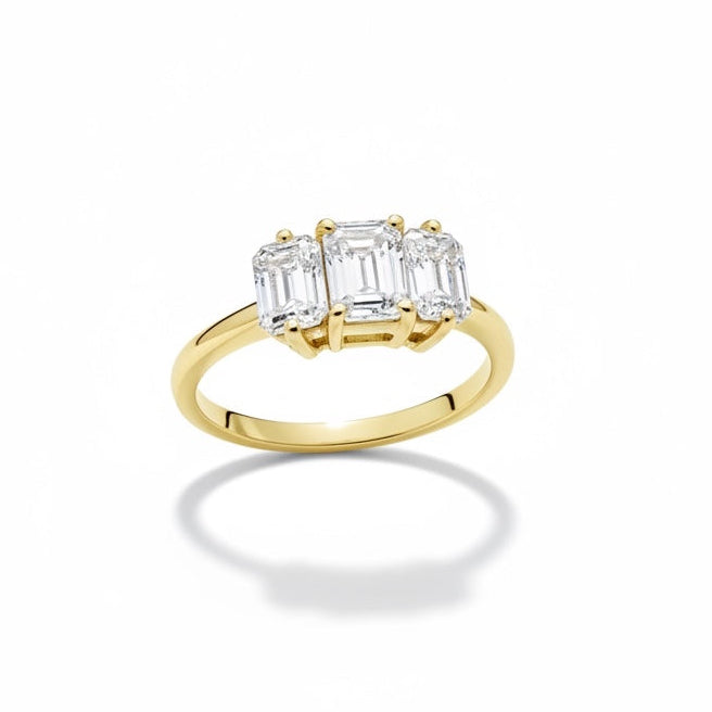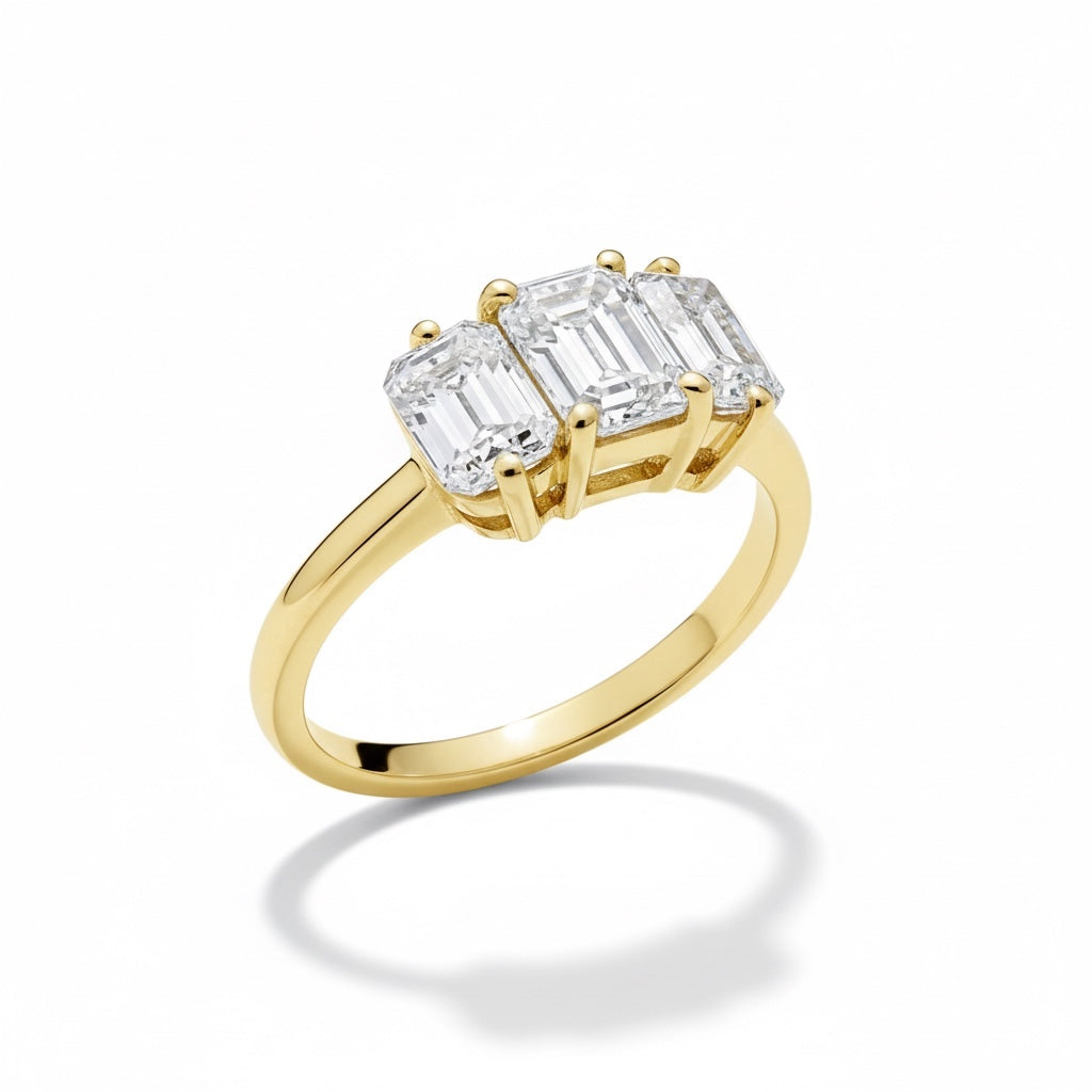 טבעת זהב צהוב 14 קראט בעיצוב טריו מדהים, משובצת ביהלומי מעבדה בחיתוך אמרלד קט במשקל כולל של 1.80 קרט.
