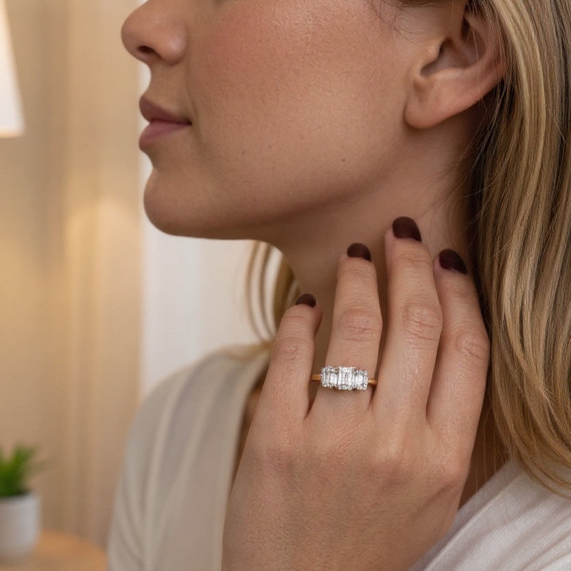 עיצוב טריו קלאסי ואלגנטי עם שלושה יהלומים מרהיבים בחיתוך אמרלד מודרני. טבעת אירוסין מושלמת או מתנה מיוחדת לאירועים חשובים.