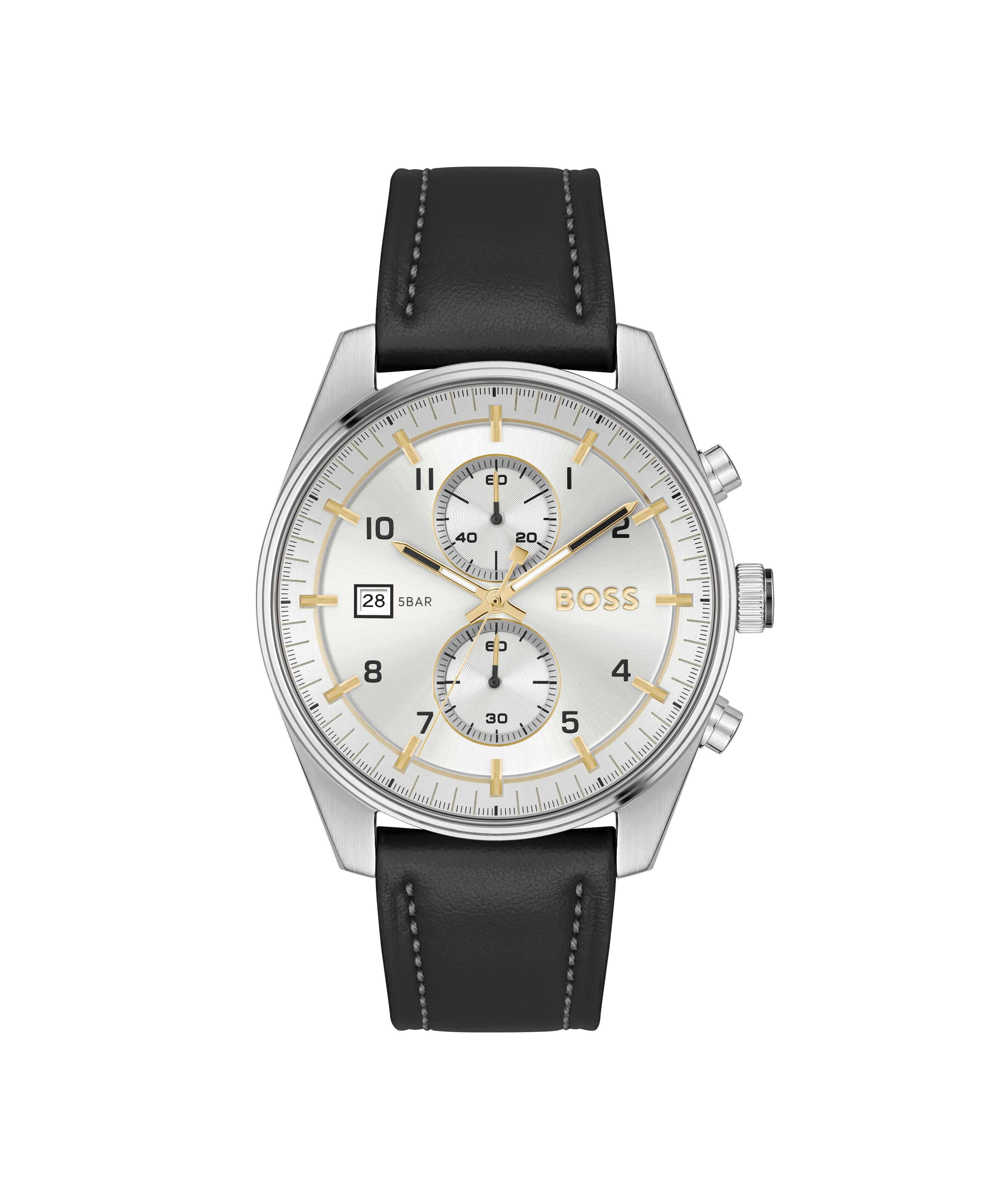 שעון Hugo Boss Skytr דגם 1514147 עם לוח כסף ורצועת עור שחורה איכותית. שעון בהשראת שעוני טייסים קלאסיים, מתאים לעבודה ולחיי היום יום.