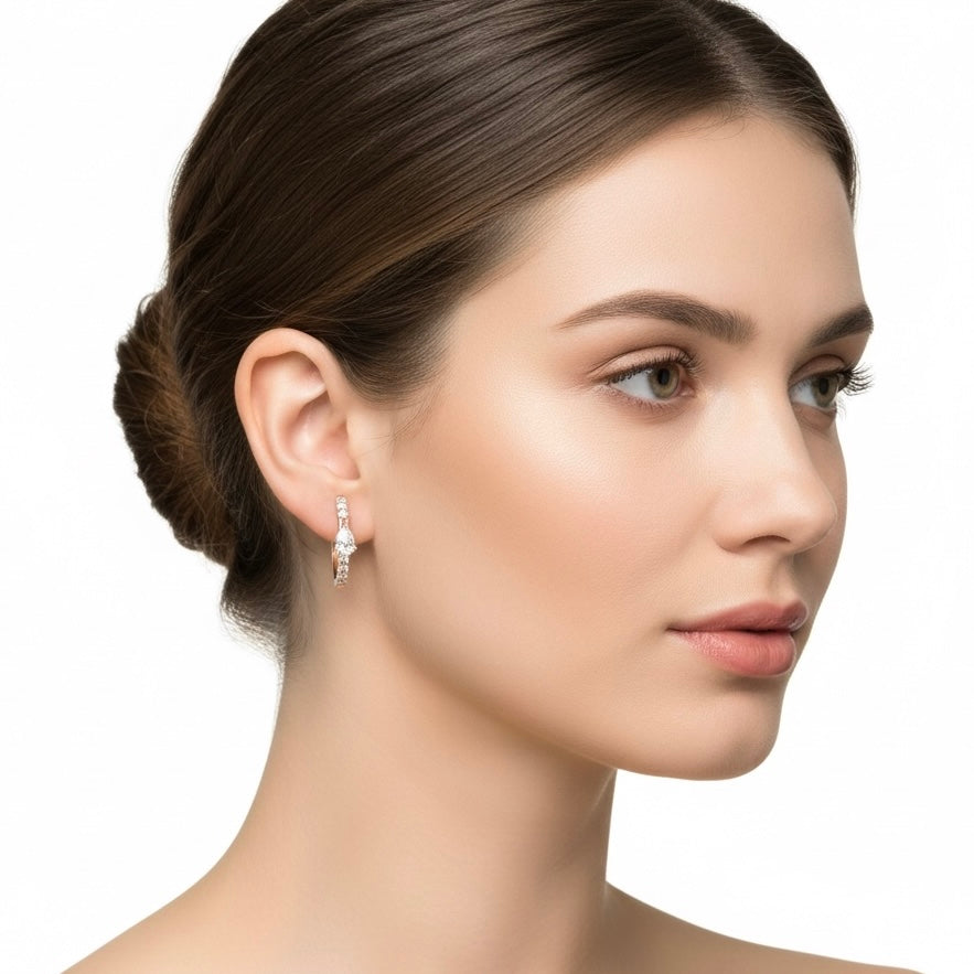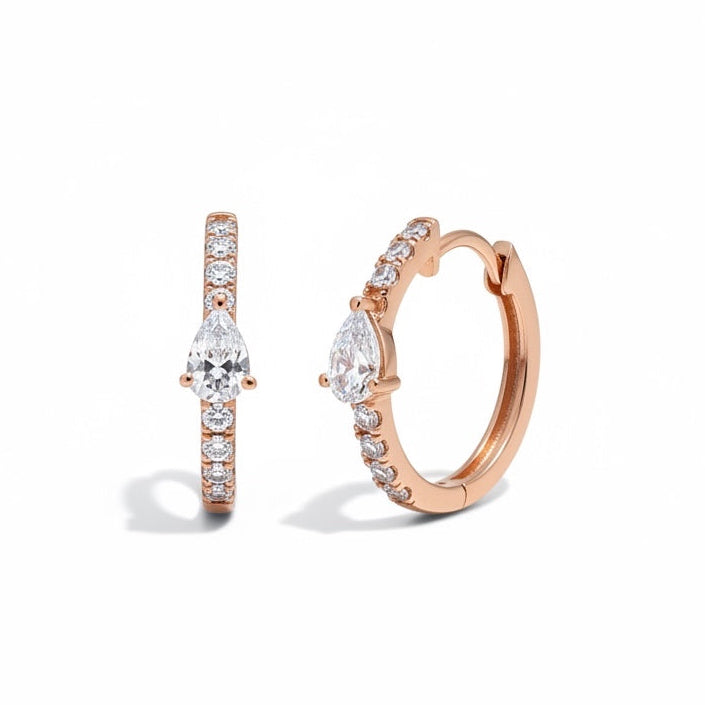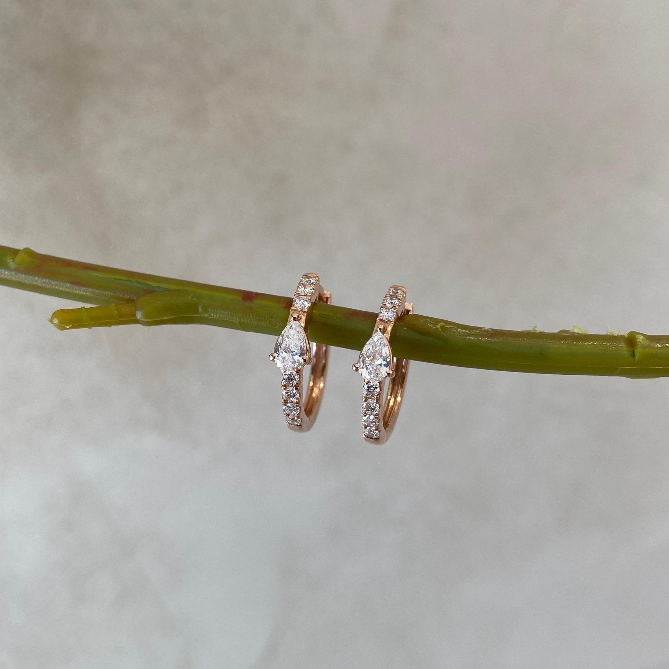 עגילי חישוק מרהיבים מזהב רוז גולד 14 קראט, משובצים ביהלומי מעבדה איכותיים בחיתוך טיפה ועגול.